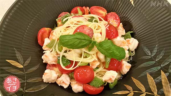 2025年9月16日、NHK「あさイチ」で紹介された、「えびとトマトの冷製パスタ」の作り方。
