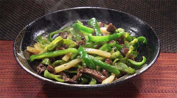 - ピーマンを入れてさらに炒め、取り出しておいた牛肉を戻す。合わせ調味料を加えて全体に絡ませれば完成!
