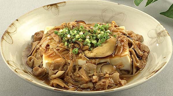 絹豆腐ときのこ(えのきだけ、しいたけ)、豚バラ肉を、とろっとした特製のあんで味わう一品。