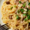 • フライパンにサラダ油少量を熱して豚肉を中火で炒め、えのきだけとしいたけを加えて炒め、煮汁の水、みりん、しょうゆ、砂糖を加えて4分煮る。