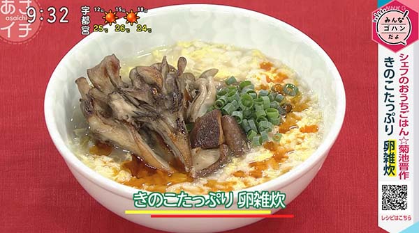 2025年10月2日、NHK「あさイチ」で紹介された、「きのこたっぷり卵雑炊」の作り方