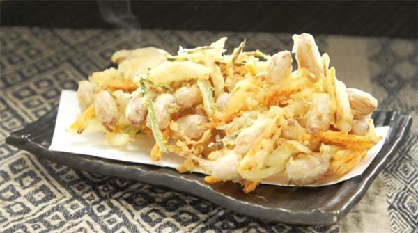 - 天ぷら粉と水を合わせて天ぷら衣を作り、【2】へ加えて全体を合わせ、170℃の揚げ油で衣がカリっとするまで揚げる。