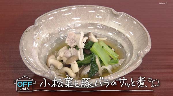 2025年10月20日放送のきょうの料理・家庭でまねできるプロの味「小松菜と豚バラのサッと煮」の作り方。