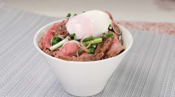 - ご飯にローストビーフ、お好みの薬味をのせて完成!
