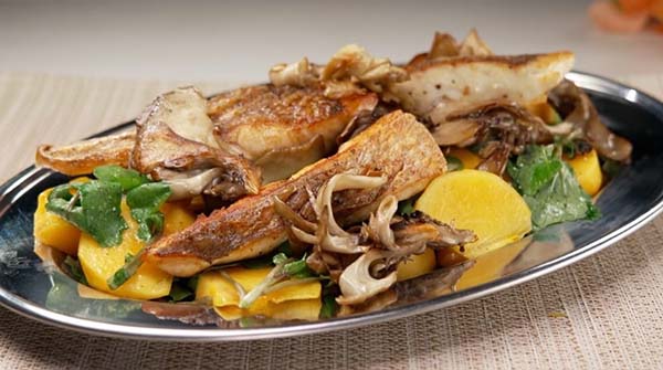 - お皿に①を盛りつけ、鯛、マイタケを盛りつけば完成!