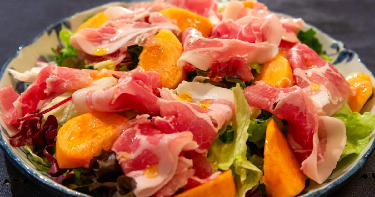 - 柿を皮をむき種をとって小さめにカットして、クレソンの葉の部分とボウルに入れ、塩・コショウを入れて混ぜ、オリーブオイル、半分にカットしたカボスの果汁をよく混ぜ合わせる