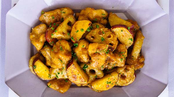 サツマイモとレンコン、鶏モモ肉を甘辛いバター醤油でこんがりと焼いたご飯が進む一品。