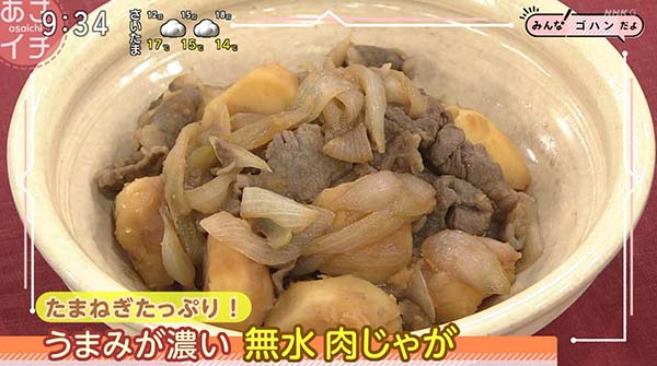 2025年10月21日、NHK「あさイチ」で紹介された、「たまねぎたっぷり無水肉じゃか」の作り方。
