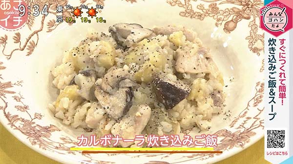 2025年10月23日、NHK「あさイチ」で紹介された、「カルボナーラ炊き込みご飯」の作り方