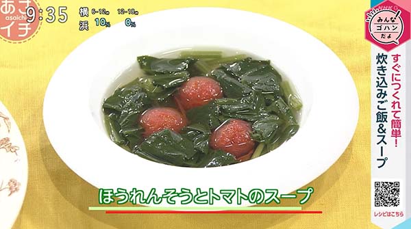 2025年10月23日、NHK「あさイチ」で紹介された、「ほうれん草とトマトのスープ」の作り方。