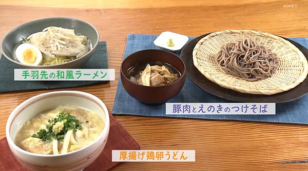 今日のレシピは日本料理店「玄斎」店主・浪速料理研究家の上野直哉さんが、「豚肉とえのきのつけそば・厚揚げ鶏卵うどん・手羽先の和風ラーメン」を紹介。