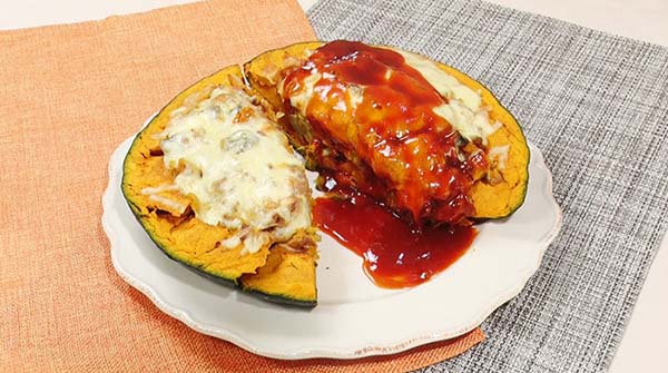 - ①のざく切りかぼちゃを粗めにマッシュし、そこに③を混ぜ合わせてかぼちゃの器に詰め、トースターで10分ほど焼く。
