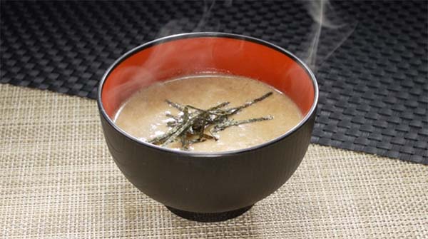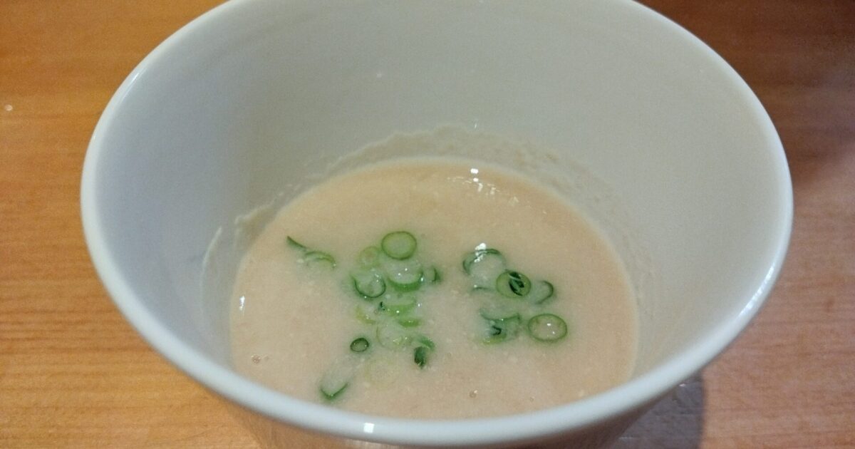 - 里芋、しょうが、味噌、白だし、牛乳、水をハンドブレンダーで攪拌し、中火にかける。焦げ付かないように混ぜながら温める。