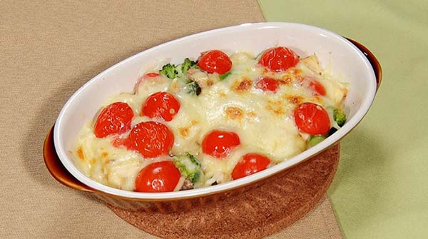 - ③を耐熱容器に薄く広げ、ミニトマト・シュレッドチーズをのせて、トースター(180℃)で3分香ばしく焼いたら完成!