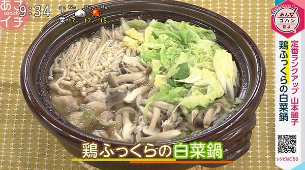 2025年11月11日、NHK「あさイチ」で紹介された、「鶏ふっくらの白菜鍋」の作り方。
