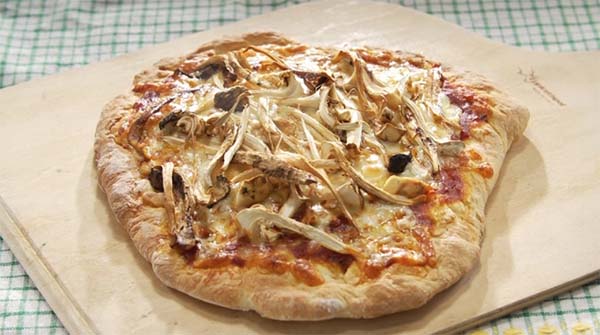 - 松茸は石づきを削り取り、軽く拭く。手で細かく裂く。生地の発酵が完了したら、打ち粉(強力粉・分量外)をし、丸く伸ばす。