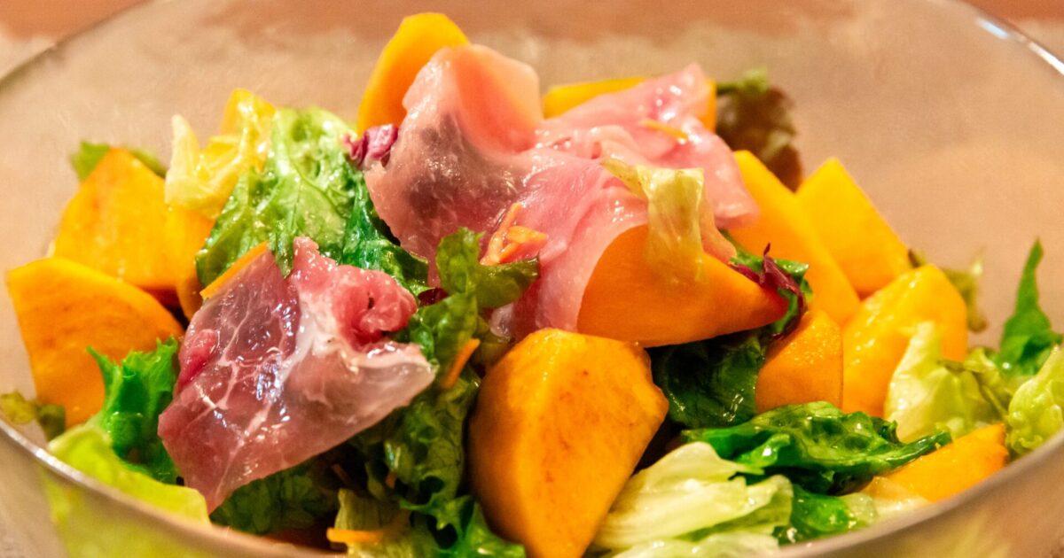 旬の柿と春菊を合わせるた彩り豊かなサラダ。