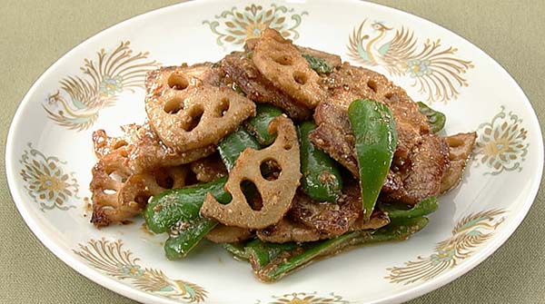 - フライパンにサラダ油を熱し、豚肉を中火で色が変わるまで炒め、れんこん、ピーマンの順に炒め、にんにくを加えて炒め合わせる。