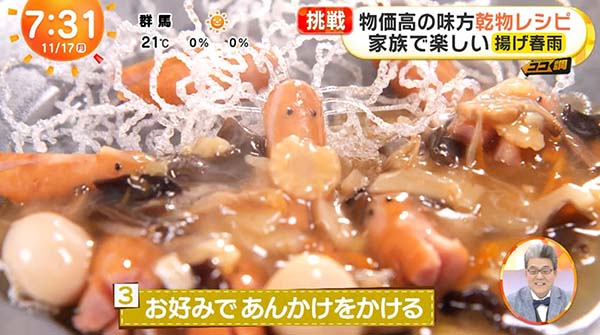 2025年11月17日放送のめざましテレビのココ調で放送された、「乾物アレンジレシピまとめ」をご紹介。 今日紹介したのは「春雨麻辣湯・うなぎ・つくね・いなりずし・オムレツ・ソーセージ春雨」 物価高の今 ...