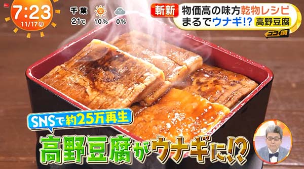 2025年11月17日放送のめざましテレビのココ調で放送された、「高野豆腐 ウナギ」をご紹介。