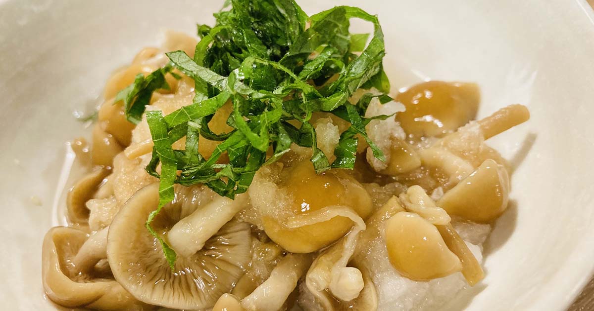 • えのきは根元を取り除く。焼きぶり大根の煮汁にくぐらせて火を入れ、食べやすい長さに切る