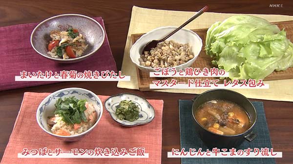 今日のレシピは旅館「美山荘」四代目当主・中東久人さんが、「ごぼうと鶏ひき肉のマスタード仕立てレタス包み・にんじんと牛こまのすり流し・まいたけと春菊の焼きびたし・みつばとサーモンの炊き込みご飯」の4品を紹介。
