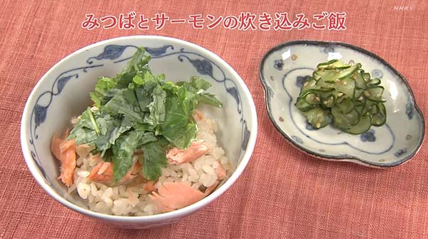 2025年11月26日放送のきょうの料理・香りで手軽にワンランクアップレシピ「みつばとサーモンの炊き込みご飯」の作り方をご紹介。