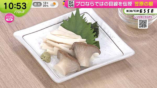 2025年11月25日、「ノンストップ」で紹介された「エリンギのイカそうめん風」のレシピ。