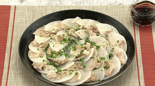 - 耐熱の皿に大根と豚肉を外側から交互に円状に並べ、塩、こしょう、酒をかけ、ふんわりとラップをかけて600Wの電子レンジで6分加熱する。