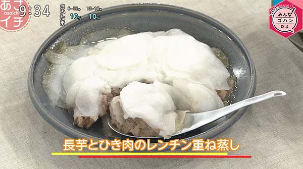 2025年12月2日、NHK「あさイチ」で紹介された、「長芋とひき肉のレンチン重ね蒸し」の作り方。