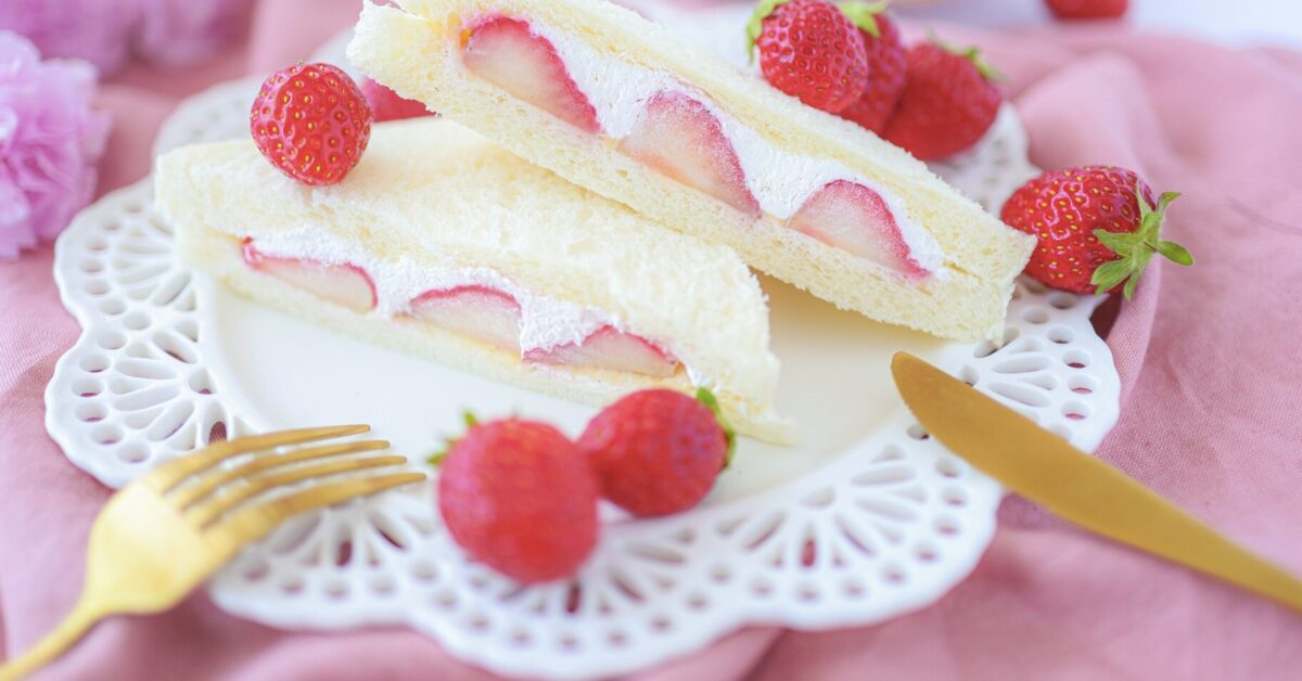 - パンの上に(1)の半量を均等に塗り伸ばし、パンをのせ、八分~九分立てにしたBの生クリームを塗り伸ばして、半分にカットしたいちごを並べて生クリームを塗る。さらに残りの(1)を塗ったパンをのせ、、もう一枚のパンをのせる。