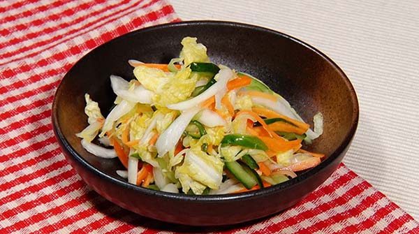 - 具材を切る。(白菜・きゅうり・にんじん:5cmの細切り)