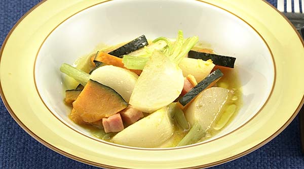 - フライパンにベーコンとバージンオリーブ油(大さじ1/2)を入れて中火で炒め、かぶ、かぼちゃ、カレー粉、塩を加えて香りが出るまで炒め、ブイヨンを加えて蓋をし、コトコト煮立った状態で8分蒸し煮にする。