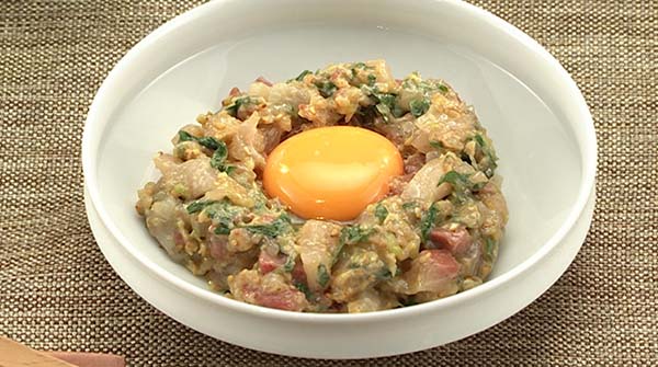 - ②に③、ごま油、しょうゆ、いりごまを加えて混ぜ、器に盛り、卵黄をのせれば完成!
