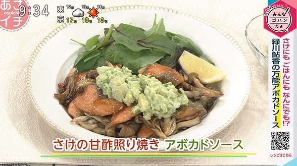 2025年12月8日、NHK「あさイチ」で紹介された、「アボカドゾースで鮭の甘酢照焼」の作り方。