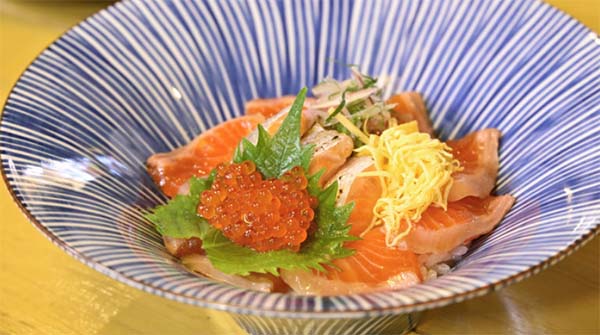 「サーモンのレアかつ揚げ ・レッドキャビア(いくら)たっぷりの親子丼 ・サーモンのシチュー」などを堪能。