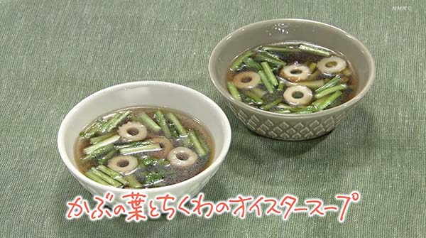 2026年1月5日放送のきょうの料理「かぶの葉とちくわのオイスタースープ」の作り方をご紹介。