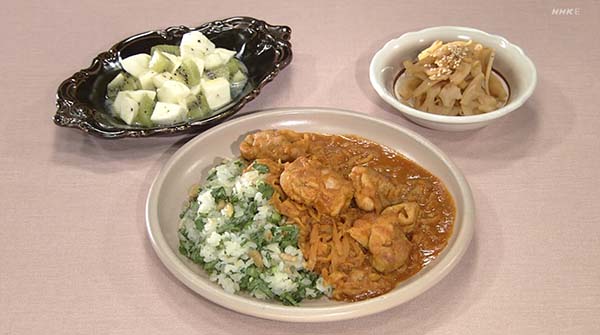 今日のレシピは料理研究家、管理栄養士の長谷川あかりさんが、「トマトチキンカレー・れんこんの即席漬け・キウイとモッツァレラチーズのサラダ」の3品を紹介。