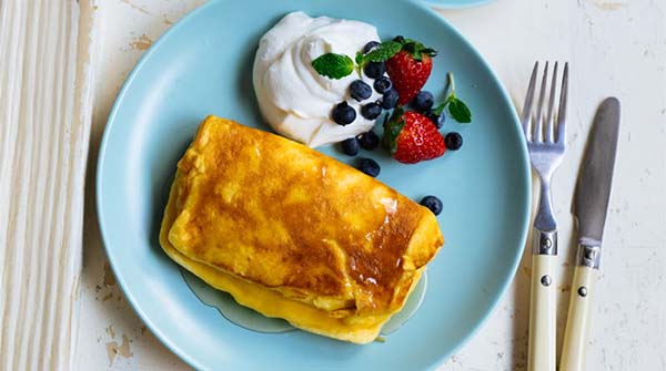 - ホイップクリーム、フルーツをのせてミントを飾り、メイプルシロップをかければ完成!