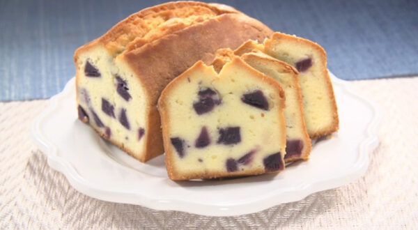 - 薄力粉を2~3回に分けながら入れ、その都度切るように混ぜる。粉気が消え、生地に艶が出たら【2】のふくむらさきを加えて混ぜ、型に入れる。できるだけ平らにならし、170℃に予熱したオーブンで約50分焼く。