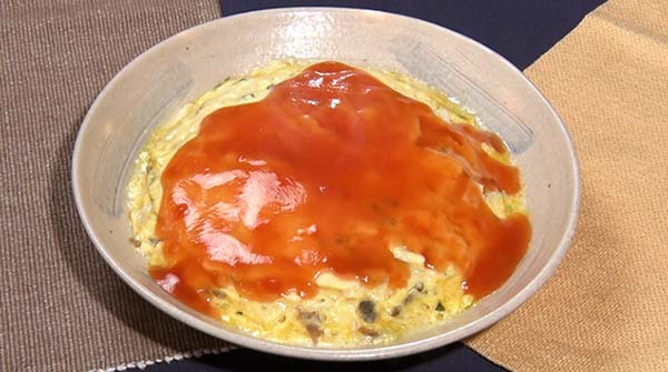 - フライパンにケチャップ・すし酢・水溶き片栗粉・水を入れ、とろみが出るまで加熱して【あん】を作り、③の上にかければ完成!