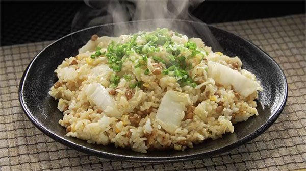 • 中華鍋に残りのサラダ油を入れ、卵を入れる。卵の白身が焼けてきたらごはんを入れて炒め、パラパラになってきたら白菜と納豆を入れ、さらに炒める。
