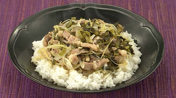 2026年1月20日のDAIGOも台所の「漬物と鶏の煮もの・豚バラと高菜の蒸しごはん・いかの一口カツ」の中から「豚バラと高菜の蒸しごはん」の作り方をご紹介します。