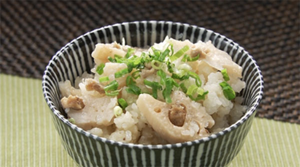 - 炊きあがったらレンコンを崩しながらよく混ぜて茶碗に盛り、お好みで青ネギを散らせば完成!