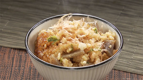 - 炊き上がったら全体をよく混ぜて茶碗に盛り、かつお節を散らせば完成!