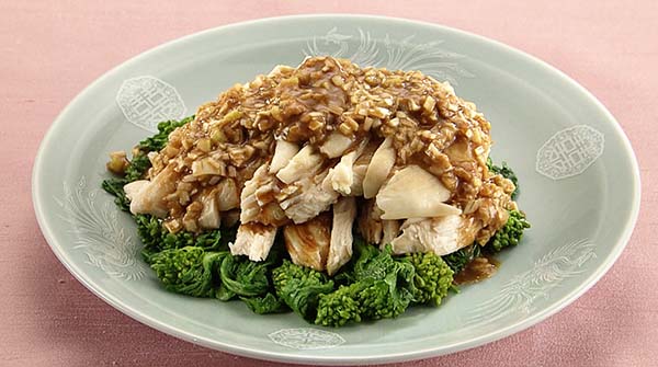 鶏胸肉をしっとりとゆで上げ、その旨みが残ったゆで汁で菜の花を仕上げるのがポイントです。