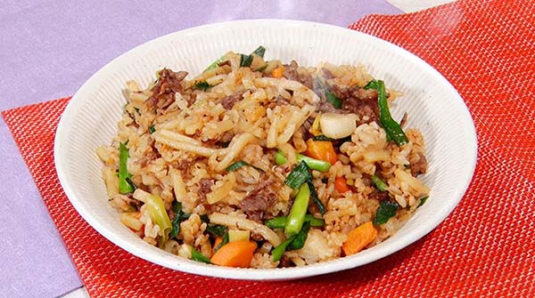 - 肉の色が変わったら、うどん・ごはんをいれてさらに炒め、塩・中濃ソース・ケチャップ・しょうゆで味をととのえたら完成!