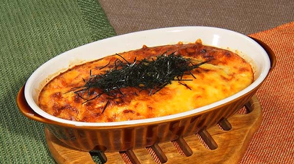 - 耐熱容器に③を流し入れ、チーズをのせてオーブントースター(250℃)で香ばしい焼き色がつくまで10分ほど焼く。最後に刻みのりを乗せれば完成!