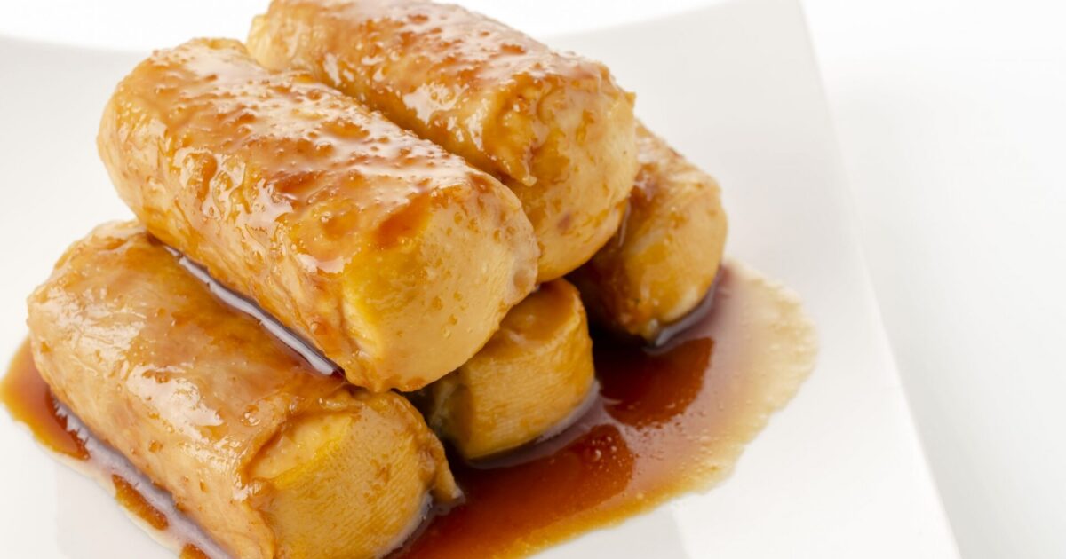 • フライパンにサラダ油(小さじ1)を中火で熱し、③の巻き終わりを下にして入れる。2~3分間焼いてこんがりとしたら上下を返し、さらに2分間ほど焼く。余分な脂を紙タオルで拭き、【A】をもう一度混ぜてから加え、煮立たせながら照りよくからめる。