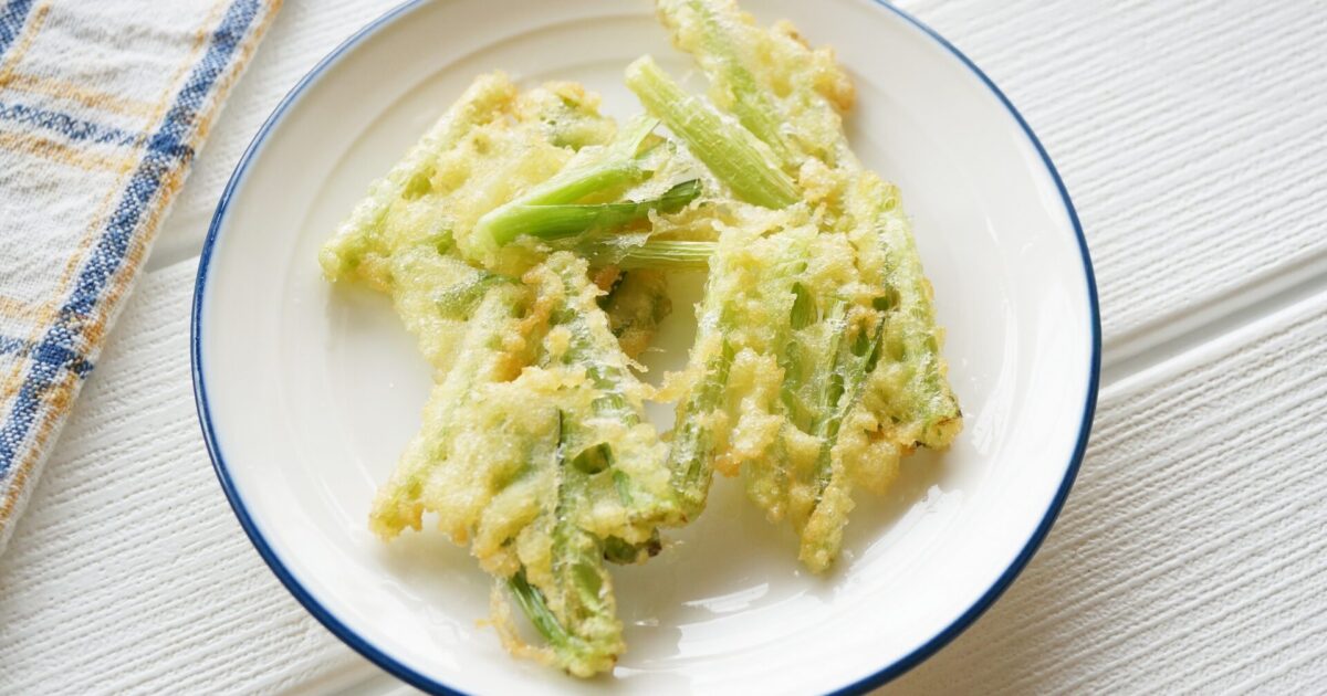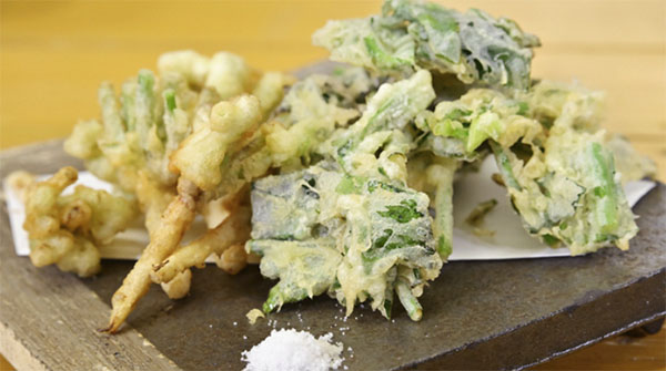 - ①の根は水分を拭き、薄く打ち粉(天ぷら粉)をまぶす。水で溶いた天ぷら粉にくぐらせ、180℃の油で揚げる